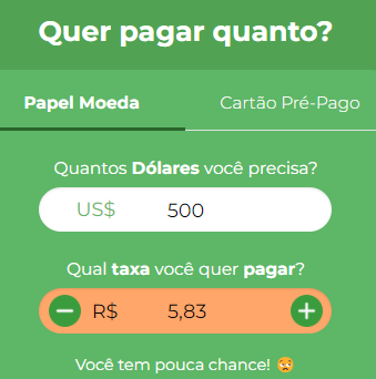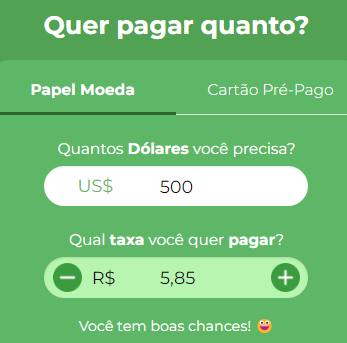 Em seguida, a partir desse valor médio, você escolhe por quanto quer pagar para comprar ou vender a moeda. Esse "lance" é oferecido para as casas de câmbio parceiras da Melhor Câmbio. Antes de dar sua oferta final, você ainda confere a possibilidade de as lojas aceitarem a proposta!